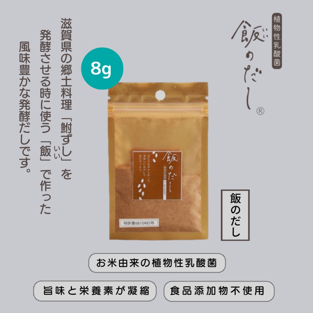 鮒寿司は、塩漬けにしたフナを炊いたご飯で漬けて発酵させたものです。その発酵したご飯の部分を「飯(いい)」と言います。その飯をそのまま乾燥して風味豊かな発酵だしを作りました。